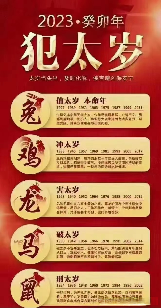 对于2023年犯太岁的人来说,建议还是先请专业人士化解太岁为好。进入2023年,犯太岁的属相主要有属鼠人、属兔人、属龙人、属马人,以及属鸡人。对于这几个属相来说,犯太岁的情况都相当严重,全年会遇到很多倒霉的事情,很难拥有平和的生活状态。比如小人、口角是非、财运不好、经常破财、婚姻不顺、工作不顺、经常和人吵架……等等。犯太岁並不可怕,只要我们虔诚化解太岁到位的话,也会逢凶化吉。